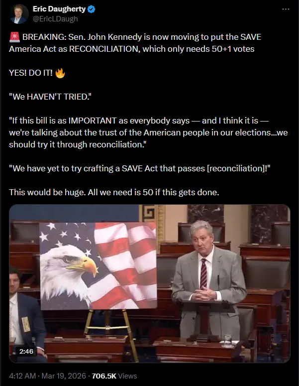 WASHINGTON, D.C. — Senator John Kennedy (R-LA) has proposed a high-stakes legislative maneuver to break the stalemate over the SAVE America Act. In a floor speech that has sent ripples through the Capitol, Kennedy urged Republican leadership to abandon the traditional 60-vote path and instead pursue budget reconciliation—a move that would allow the bill to pass with a simple majority.